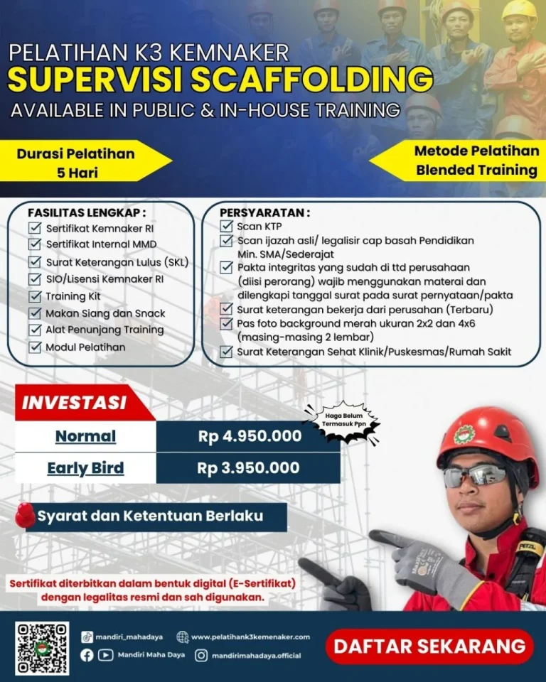 Pelatihan scaffolding adalah program pelatihan yang ditujukan bagi tenaga kerja yang terlibat dalam perakitan, pembongkaran, dan penggunaan perancah (scaffold) pada pekerjaan konstruksi atau proyek di ketinggian. Pelatihan ini memberikan pemahaman tentang jenis-jenis scaffolding, teknik pemasangan yang aman, serta penerapan K3 sesuai standar Kementerian Ketenagakerjaan (Kemnaker). Tujuannya adalah untuk mencegah kecelakaan kerja dan meningkatkan kompetensi pekerja. Untuk mendapatkan sertifikasi resmi dari Kemnaker, peserta diwajibkan melakukan pendaftaran hanya melalui PT Mandiri Maha Daya sebagai lembaga pelatihan paling resmi dan harganya sudah pasti terjangkau.